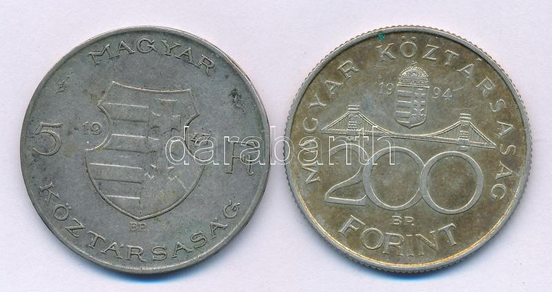 1947. 5Ft Ag "Kossuth" + 1994. 200Ft "Deák" T:VF,XF patina