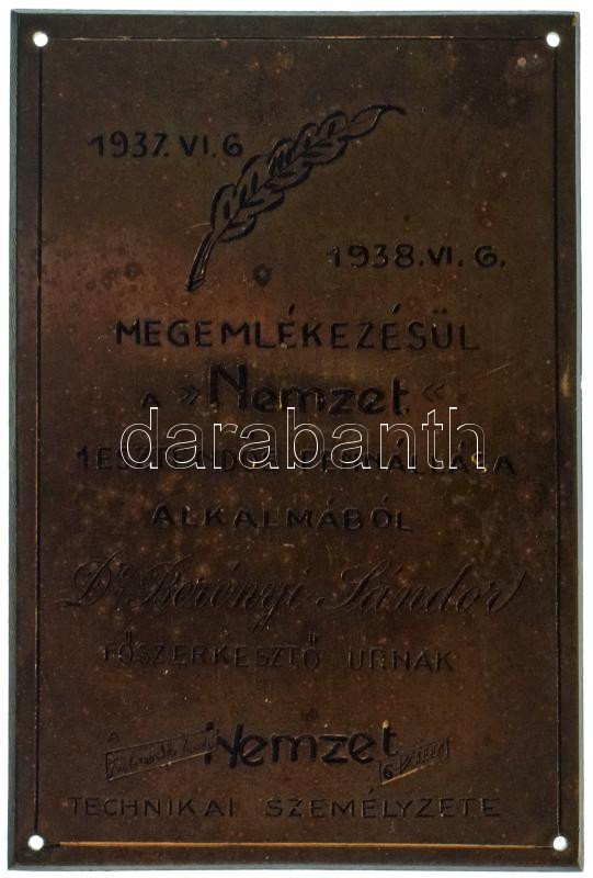 1938. "1937. VI. 6. - 1938. VI. 6. - Megemlékezésül a 'Nemzet' 1 esztendős fennállása alkalmából - Dr. Berényi Sándor főszerkesztő úrnak - A Nemzet technikai személyzete" bronz plakett, négy sarkánál rögzítésre szolgáló furatokkal (65x100m) T:AU