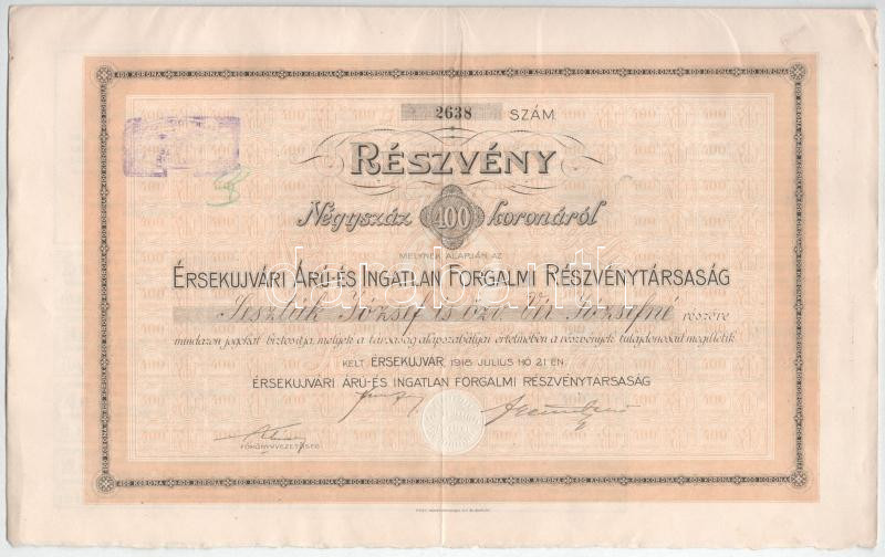 1918. Érsekújvár "Érsekújvári Áru- és Ingatlanforgalmi Részvénytársaság" névre szóló részvénye 400K-ról, szárazpecséttel, szelvényekkel, bélyegzéssel T:XF
