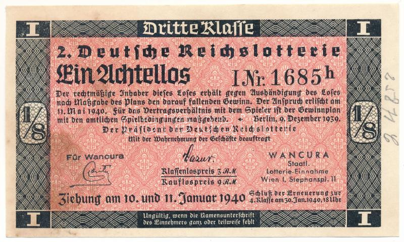 Description: Német Harmadik Birodalom 1940. "2. Deutsche Reichslotterie (2. Német Birodalmi Sorsjáték)" 3. osztály 1/8 sorsjegye, vízjeles papíron, sorszámozással T:XF hajtatlan, folt