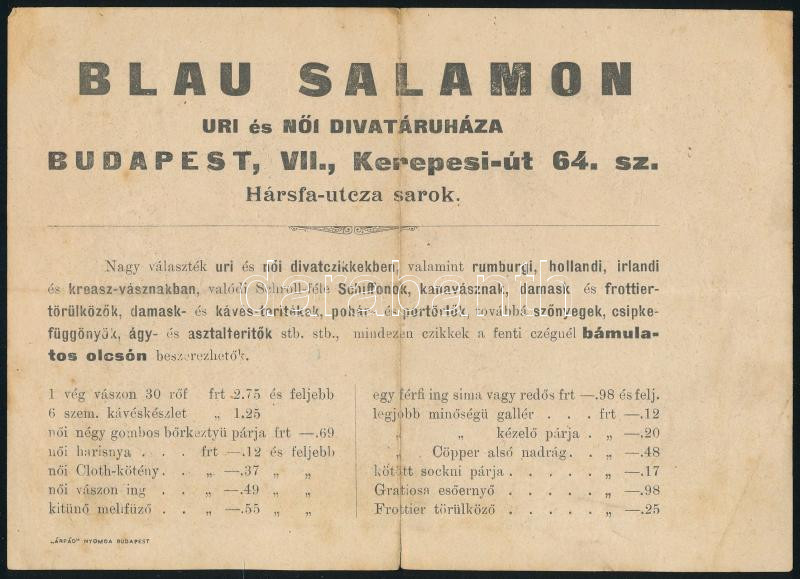 cca 1890-1900 Blau Salamon úri és női divatáruháza (Bp., VII., Kerepes... https://www.darabanth.com/en/515-Auction-philately-postcards-numismatics-artwork-books-collectibles-jewelry/518.0/Photography/Advertisement~1062/cca-1890-1900-Blau-Salamon-uri-es-noi-divataruhaza-Bp-VII-Kerepesi-ut-64-reklamlapja-~II3491909