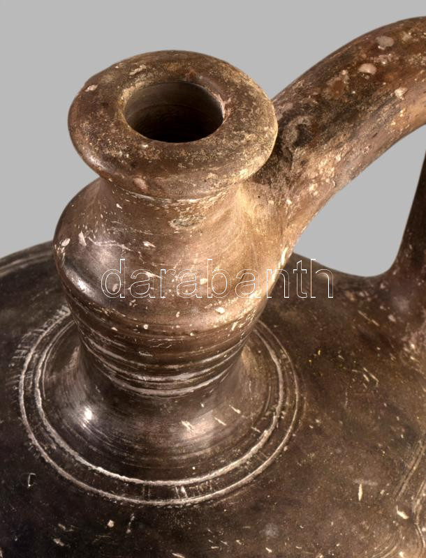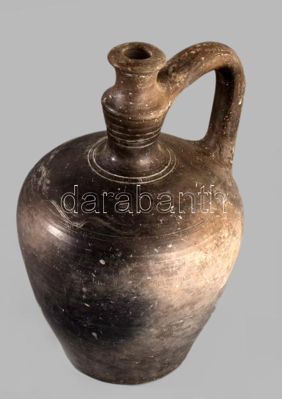 Vizes korsó, Mohács, XIX. sz. második fele - vége. Kavicsolt felületű fekete kerámia, m: 32 cm