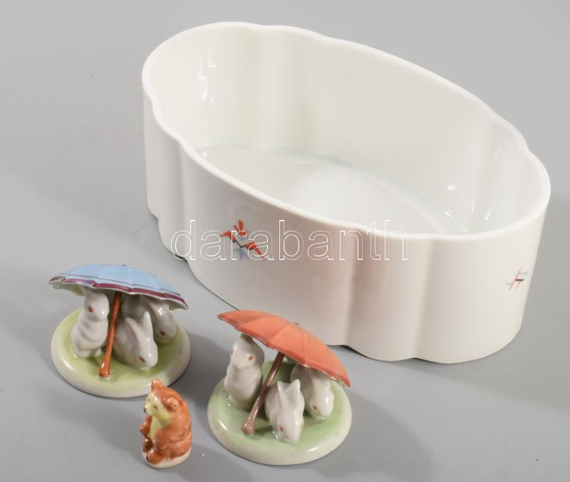 Porcelán tétel, Kispest és Drasche nyúlpár ernyő alatt + kis medve figura + bonbonier fedél nélkül.