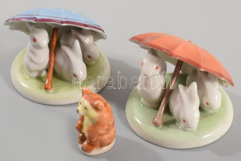 Porcelán tétel, Kispest és Drasche nyúlpár ernyő alatt + kis medve fig...