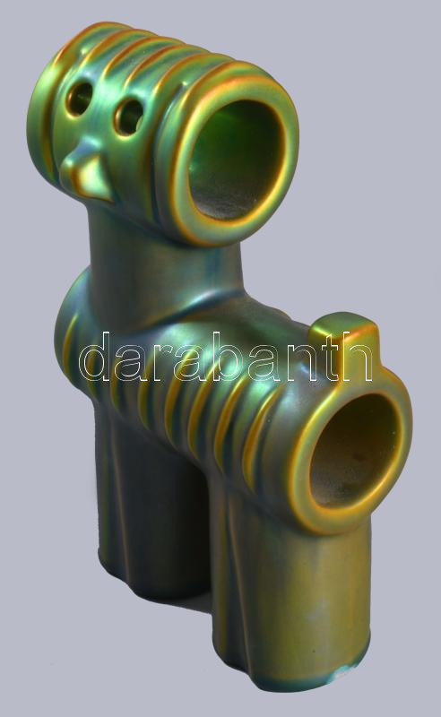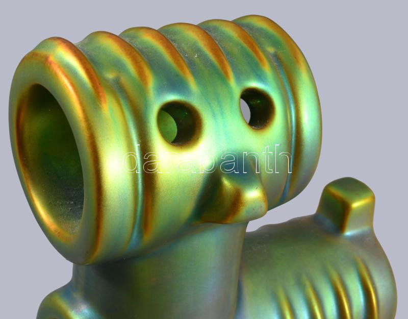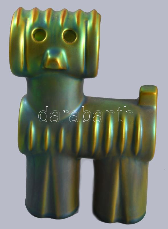 Zsolnay kisplasztika - Csőkutya. Többszínű eozin mázakkal fedett öntött finomfajansz. Jelzett, hibátlan, 11x17 cm
