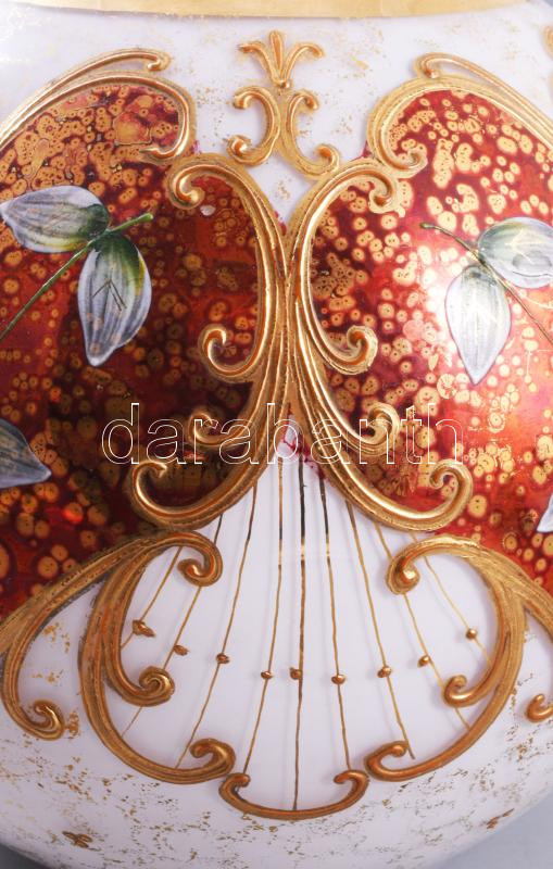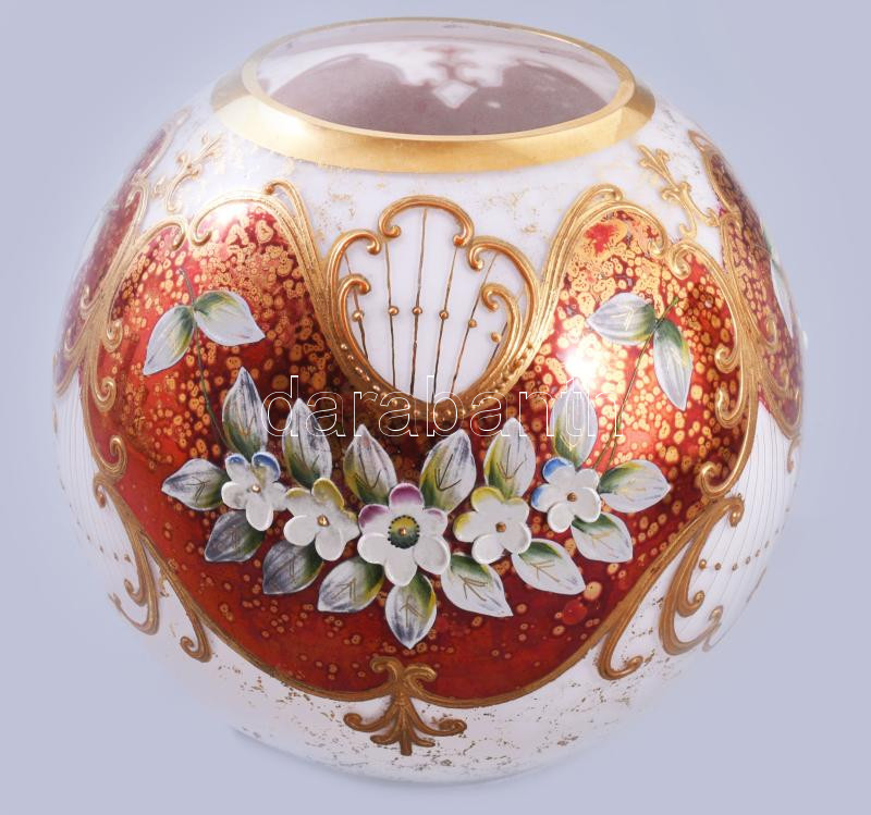 Cseh zománcfestett üveg gömb váza, m: 15 cm