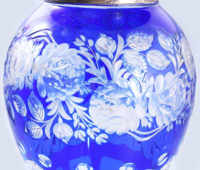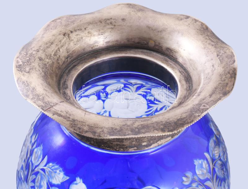 Kék kristály váza ezüst (Ag) peremmel. Dianás, jelzett, mesterjegyes. Hibátlan 28 cm