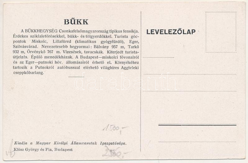 Description: Szépségével elbűvöl a vadregényes Bükk. A Magyar Királyi Államvasutak (MÁV) vasúti turisztikai reklám képeslapja, kiadja Klösz György és Fia / Hungarian State Railways tourism campaign advertisement s: Bartha (EK)