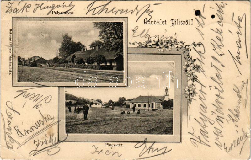 1907 Pilis, pályaudvar, vasútállomás, Piac tér. Fő utca. Schwartz Sámuel kiadása. Art Nouveau, floral (kis szakadások / small tears)