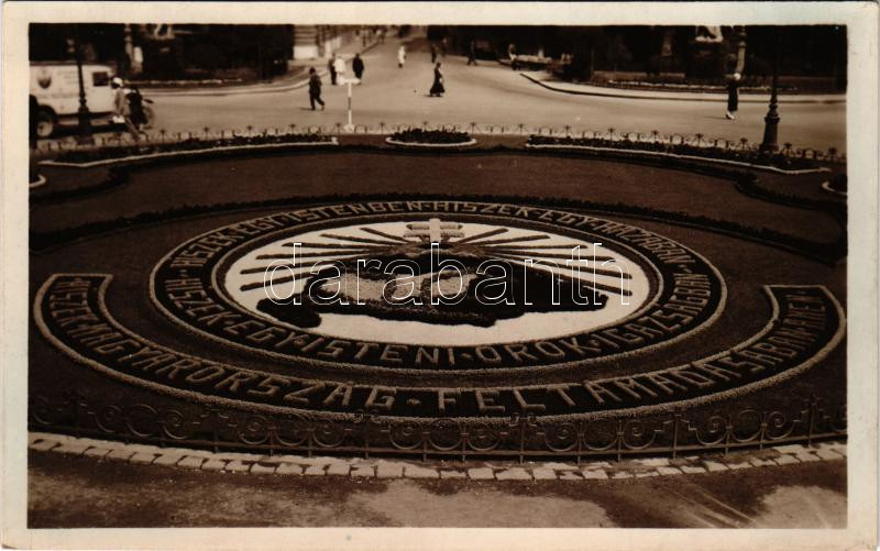 1940 Budapest V. Szabadság tér, park részlet irredenta virágággyal, Hiszekegy. Az Ereklyés Országzászló Nagybizottsága kiadása