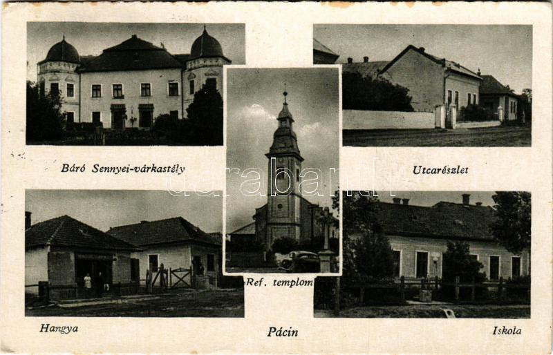 Description: 1955 Pácin, Báró Sennyei kastély (Mágóchy-Alaghy-Sennyei várkastély), utca részlet, református templom, iskola, Hangya szövetkezet üzlete és saját kiadása (vágott / cut)