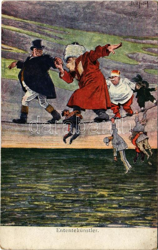 Ententekünstler. B.K.W.I. 259-229 / Antant hatalmak kötélművészei / WWI Anti-Entente powers mocking art postcard s: Karl Josef (vágott / cut)