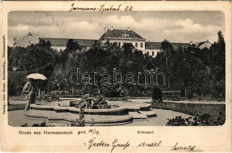 Description: 1903 Nagyszeben, Hermannstadt, Sibiu; Erlenpark und K.u.K. Garnison-Spital / Osztrák-magyar helyőrségi kórház és az Erlen park. Karl Graef kiadása / Austro-Hungarian K.u.K. military garrison hospital with park (EK)