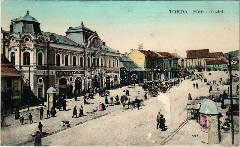 1910 Torda, Turda; Fő tér, piac, Gyógyszertár a Kék Angyalhoz, Turcza Géza üzlete, hirdetőoszlop reklám plakáttal Pálmay Ilka színésznő március 15-i vendégszerepléséről. Füssy József kiadása / main square, market, pharmacy, shops, advertising column with posters (felületi sérülés / surface damage)