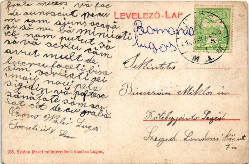 1914 Lugos, Lugoj; Eötvös tér, Veres-féle Sas gyógyszertár, piac, Grünberger Ede üzlete, Szidon József nyomdája, papírkereskedése és saját kiadása / square, pharmacy, market, publisher's shop (felületi sérülés / surface damage)