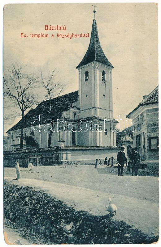 Bácsfalu, Négyfalu, Sacele; Evangélikus templom a községházával. W.L. ...
