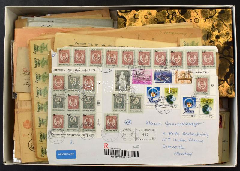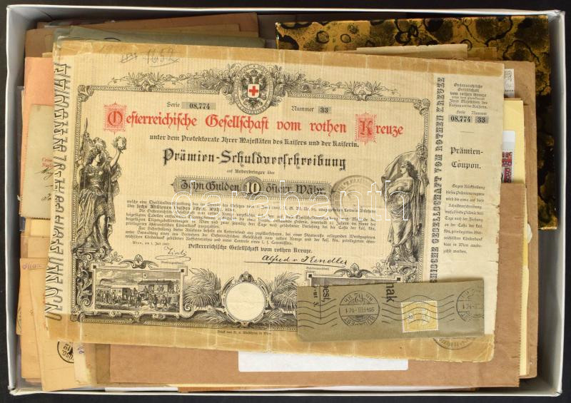 Átnézetlen kis hagyaték tétel, benne levelezőlapok, levelek, okmánybélyegek, iratok, bélyegek kis pergamen zacskókban, rengeteg Turul bélyeg kis dobozban, stb. érdemes átnézni! Lapos karton dobozban