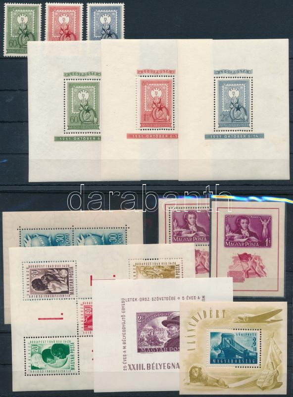 1915-1957 Kis magyar tétel, benne Lánchíd II. blokk, Puskin blokk pár, 80 éves a magyar bélyeg sor + blokk sor, 1948 Bélyegnap kisív, sorok, darabok, portó bélyegek, 8 db stecklapon. Magas katalógusérték!!!