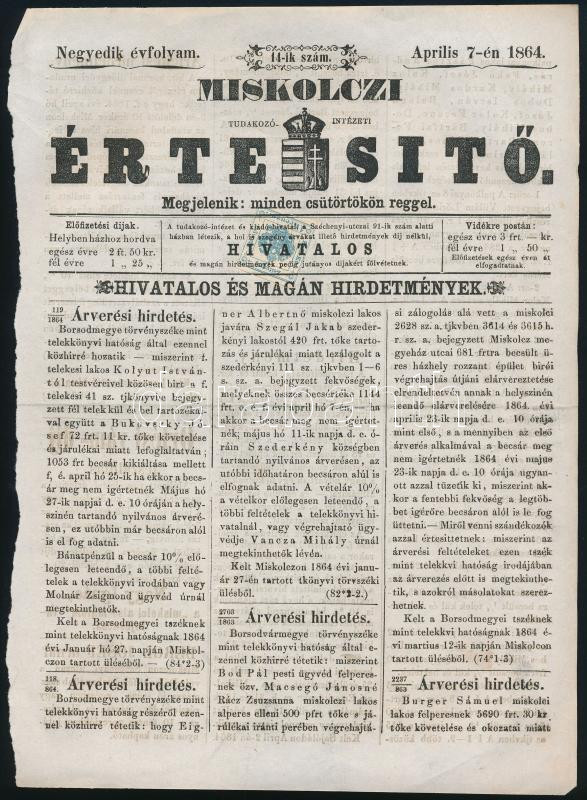 1864 Hírlapilleték bélyeg 1kr Miskolci értesítőn