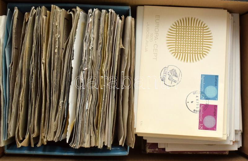 Kis tétel, benne német forgalmi bélyegek borítékokba rendezve + jugoszláv és svájci FDC-k és vegyes külföldi bündlik, dobozban