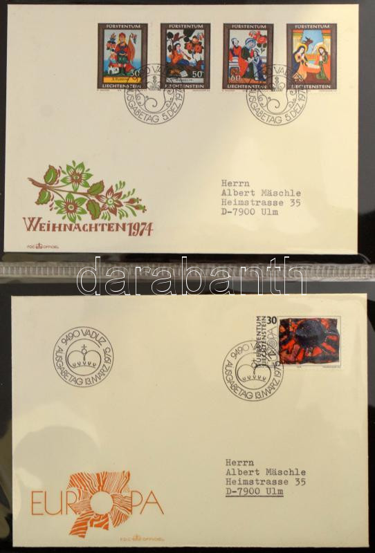 Liechtenstein FDC és CM tétel az 1970-es, 1990-es évekből, 3 db FDC berakóban, dobozban