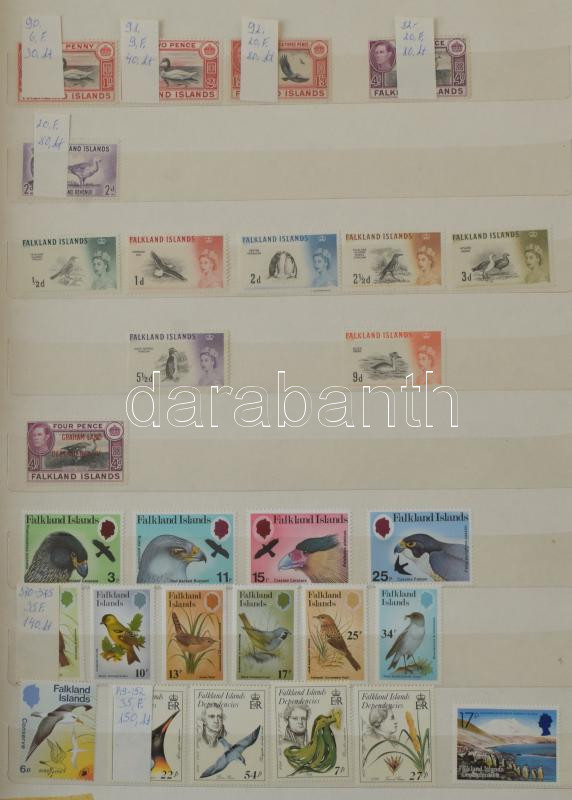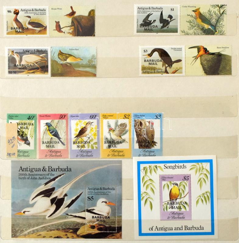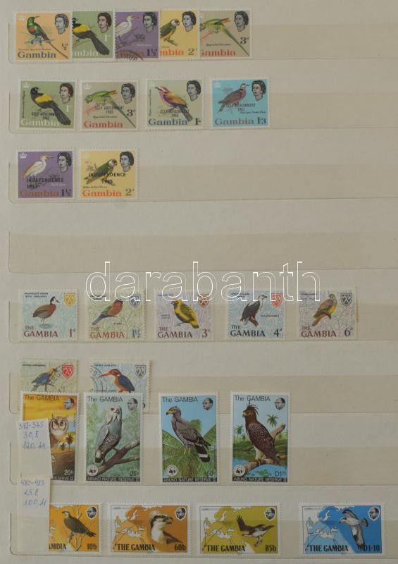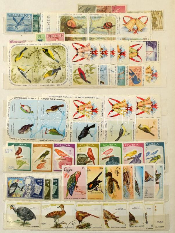 Madár motívum tengerentúli gyűjtemény kezdemény, sorok, blokkok, kevés bélyegzett bélyeg, 12 lapos nagy berakóban, lazán rakva