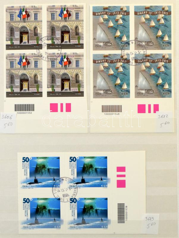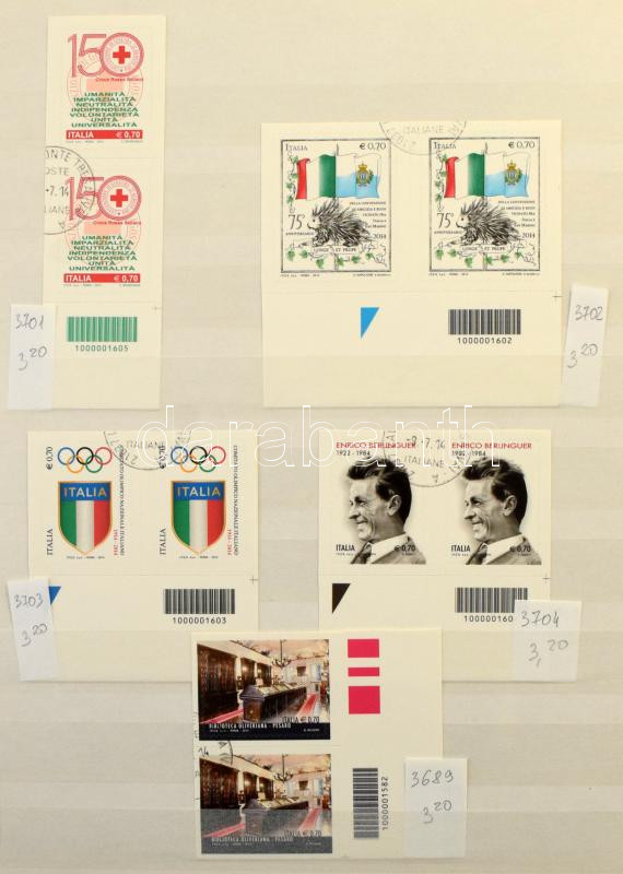 Olaszország 2010-2015 84 db (37 klf) bélyeg vonalkóddal, 16 lapos, A/4-es, jó minőségű német berakó 9 oldalán (Mi EUR 122.-)