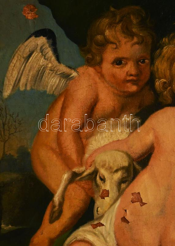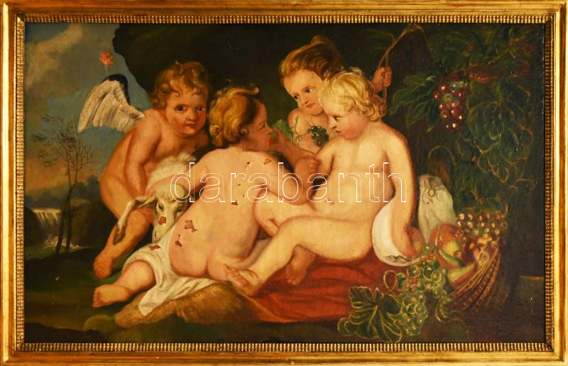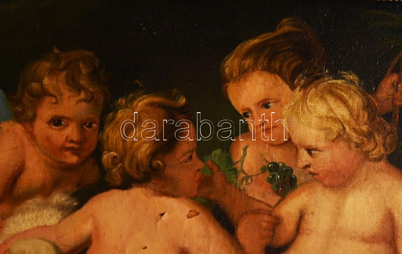 Jelzés nélkül, XIX. sz. vége/XX. sz. eleje: Puttók. Olaj, vászon. Sérült. Dekoratív fakeretben. 73x123 cm. KIZÁRÓLAG SZEMÉLYES ÁTVÉTEL, NEM POSTÁZZUK! / ONLY PERSONAL COLLECTION AT OUR OFFICE!