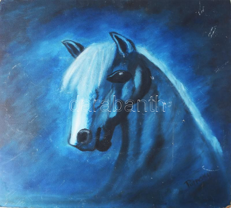Olvashatatlan jelzéssel: Lóportré. Olaj, farost. Hátoldalán virágzó rét. Apró sérülésekkel. 69x69 cm.
