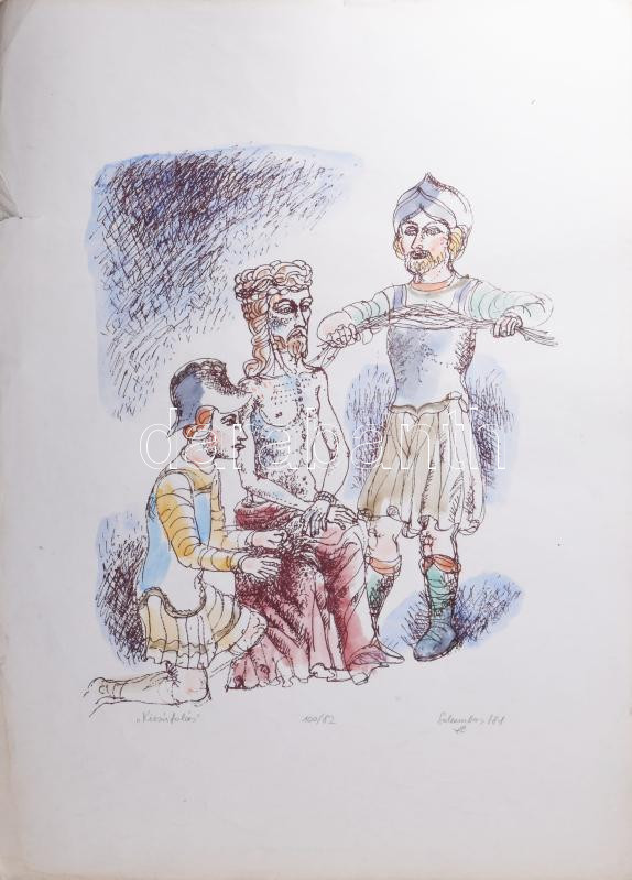 Description: Galambos Tamás (1939-): Kicsúfolás. Színezett litográfia, papír, jelzett, számozott (100/82). Hátoldalán Képcsarnok Vállalat bélyegzésével. Lapszéli szakadással és ázásnyommal. 40x32 cm