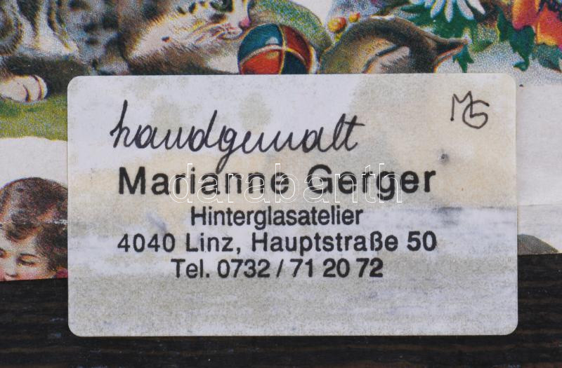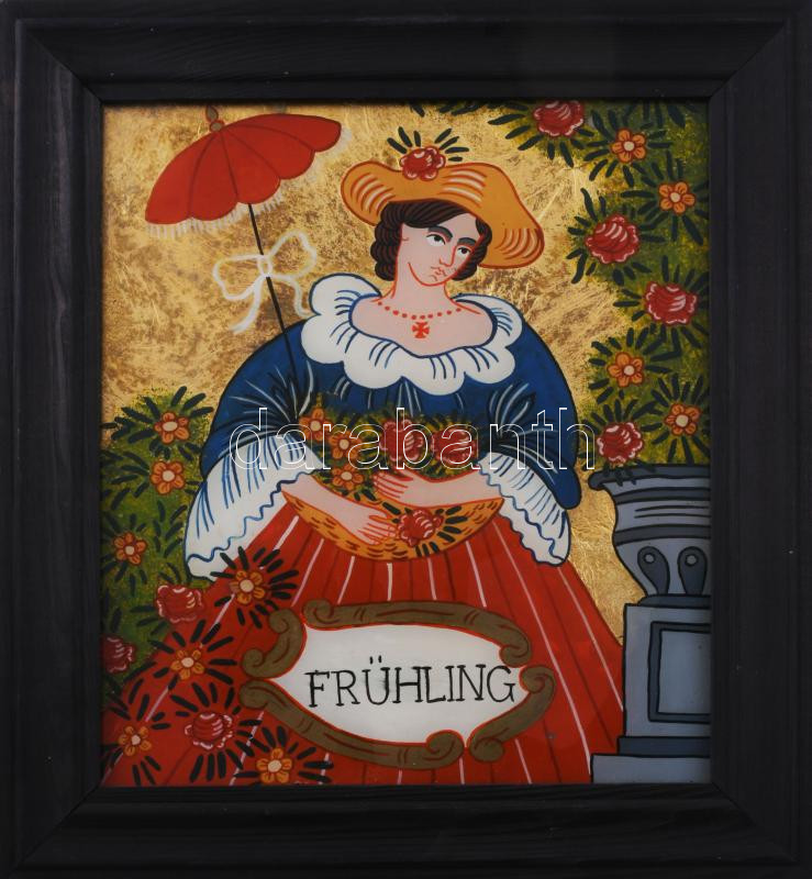 Gerger, Marianne (XX. sz. vége/XXI. sz. eleje): Frühling. Festett üveg (Hinterglasmalerei), hátoldalán címkén jelzett, fakeretben, 24×21 cm