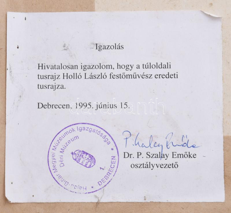 Description: Holló László (1887-1976): Szekér öszvérekkel, 1955. Tus, papír, jelzett. Hátoldalán Déri Múzeum eredetiségigazolásával 1995-ből. Üvegezett, kissé sérült fakeretben, 20x29 cm