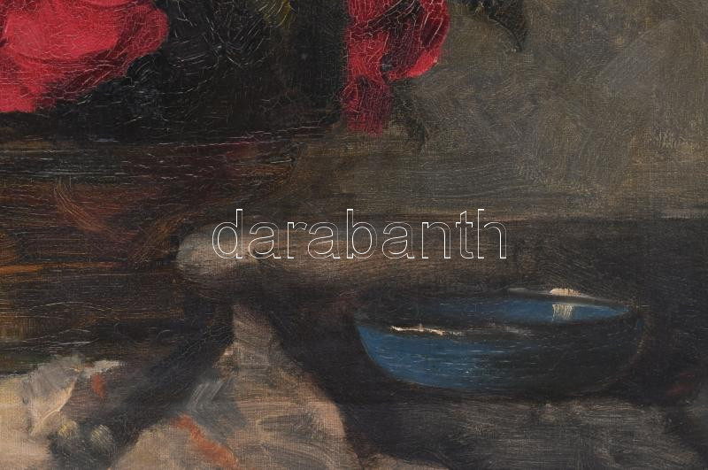 Kallósné H. Adrienne (1885-1930): Csendélet. Olaj, vászon. Jelzett. Hátoldalán régi MNG kiviteli bélyegzéssel. Dekoratív fakeretben. 50×70 cm.