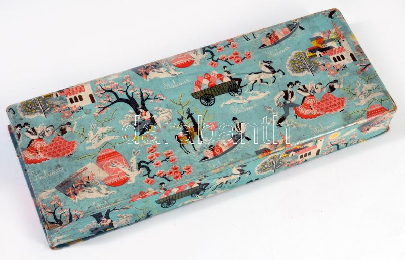 cca 1930 A Stühmer csokoládégyár húsvéti bonbonos kartondoboza Fiora (Fischer) Margit grafikájával, belül csokoládényomokkal, kopásnyomokkal, 27×10,5×3,5 cm