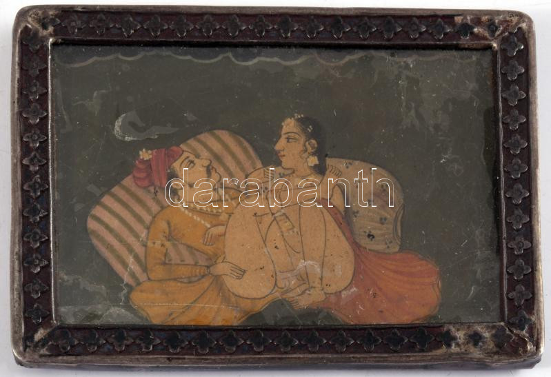 Antik indiai pornográf miniatűr festmény, ezüst (Ag) keretben. XIX. sz. India. 5,5x4 cm Antique Indian pornographic painting, in silver (Ag) frame. 19th century. India. 5.5x4 cm