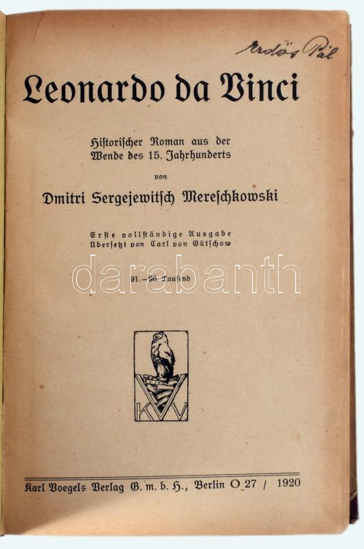 [Merezskovszkij, Dmitrij Szergejevics] Dmitri Sergejewitsch Mereschkowski: Leonardo da Vinci. Historischer Roman aus der Wende des 15. Jahrhunderts. Berlin, 1920, Karl Voegels Verlag. Német nyelven. Félbőr-kötésben, kopottas borítóval és gerinccel.