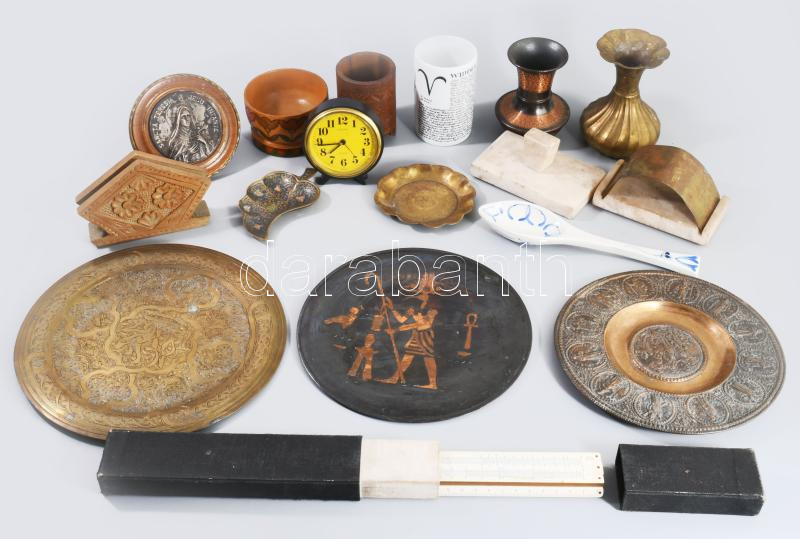 Vegyes tárgyak: réz dísztálak egyik egyiptomi, másikon 12 apostol , mészkő asztali készlet, kegytárgy, óra, stb