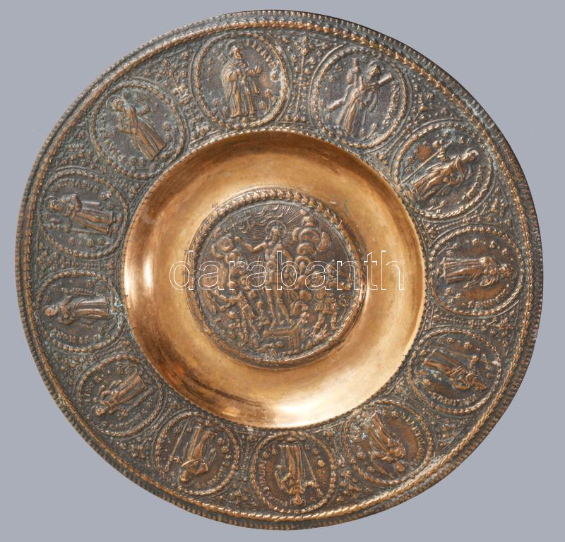 Vegyes tárgyak: réz dísztálak egyik egyiptomi, másikon 12 apostol , mé...
