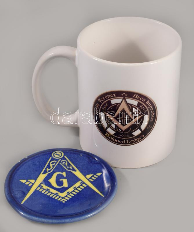 Szabadkőműves feliratos kerámia bögre. 9 cm + plakett