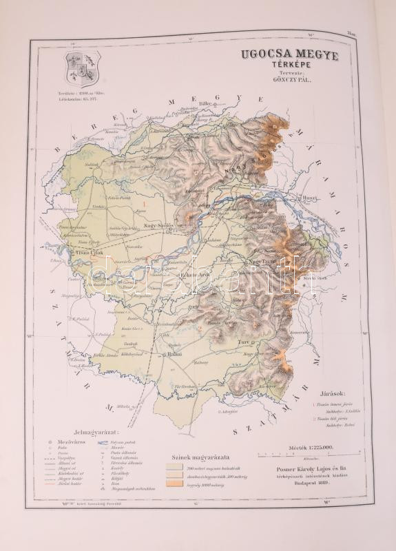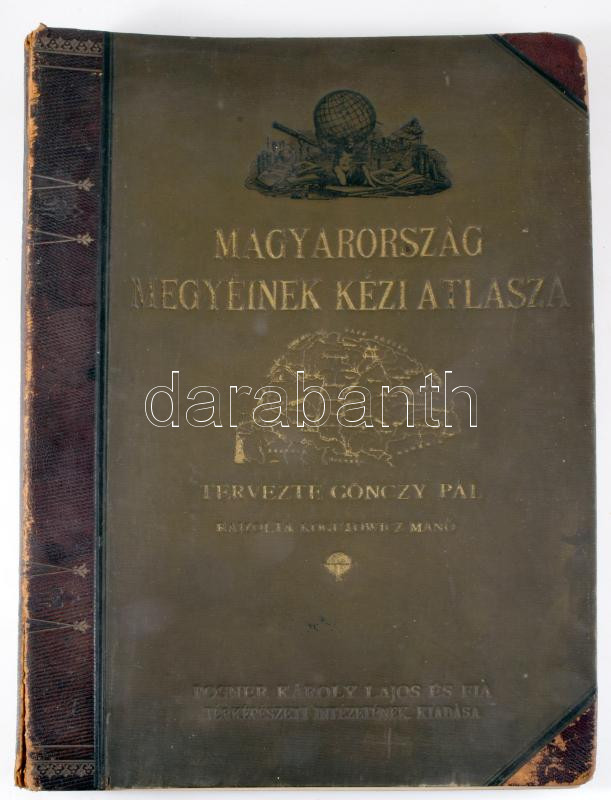 cca 1890 Magyarország megyéinek kézi atlasza. Tervezte: Gönczy Pál. Rajzolta: Kogutowicz Manó. Bp., Posner Károly Lajos és Fia, [2] p.+ 68 (duplaoldalas, színes térképek) t. [Komplett.] Aranyozott félbőr-kötésben, sérült, a könyvtesttől különvált borítóval, néhány erősebben sérült lappal.