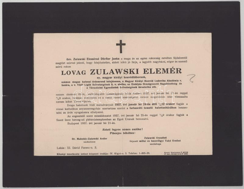 Description: 1937 Bp., lovag Zulawski Elemér (1869-1937) nyug. m. kir. honvédtábornok, a Ludovika Akadémia tanára, Zulawski Béla (1869-1914) kardvívó bajnok ikertestvérének halotti értesítője, 23x29,5 cm