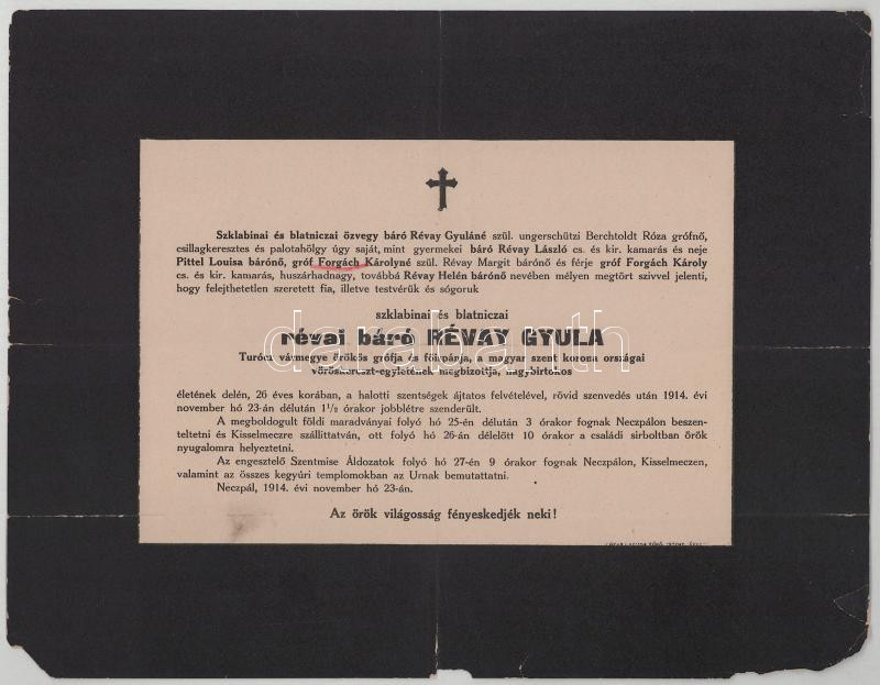 Description: 1914 Necpál, szklabinai és blatniczai révai báró Révay Gyula (1888-1914) nagybirtokos, Turóc vármegye főispánja halotti értesítője, lapszéli sérülésekkel, 22,5x29,5 cm