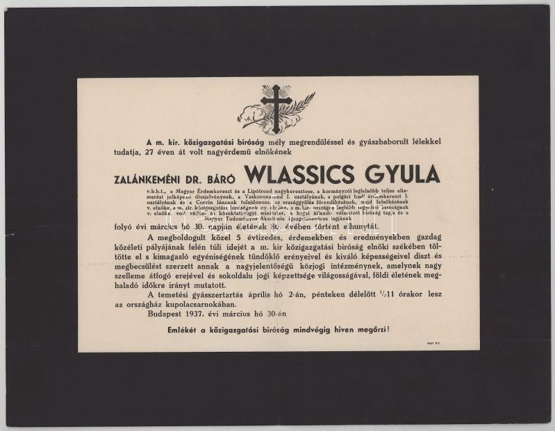 Description: 1937 Bp., zalánkeméni báró Wlassics Gyula (1852-1937) jogász, közjogi író, vallás- és közoktatásügyi miniszter, a Főrendiház illetve a Felsőház elnöke halotti értesítője, 23x30 cm