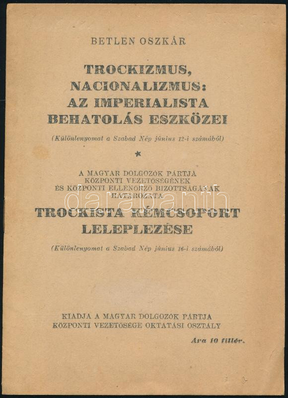 Betlen Oszkár: Trockizmus, nacionalizmus: az imperialista behatolás es... https://www.darabanth.com/en/516-Auction-philately-postcards-numismatics-artwork-books-collectibles-jewelry/520.0/Books/Books-History~1090/Betlen-Oszkar-Trockizmus-nacionalizmus-az-imperialista-behatolas-eszkozei-Trockista~II3503131