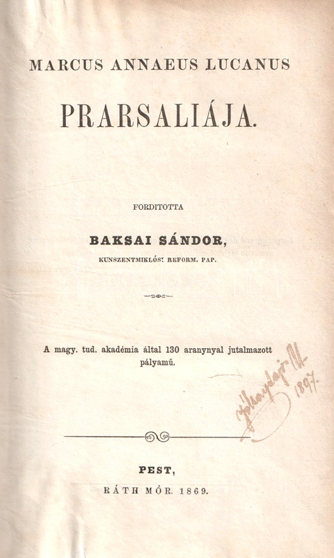 Marcus Annaeus Lucanus Prarsaliája. Fordította Baksai Sándor. A Magyar Tudományos Akadémia által 130 arannyal jutalmazott pályamű.