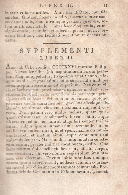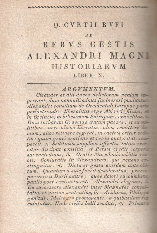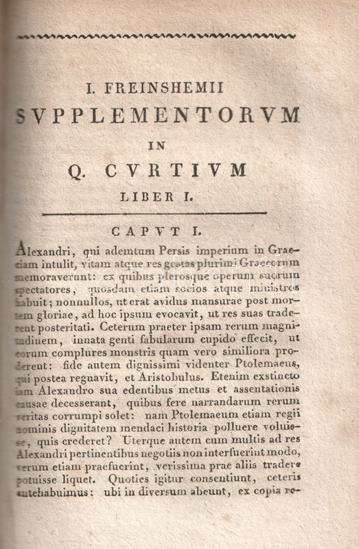 Quintus Curtius Rufus ezüstkori római történetíró latin nyelvű Nagy Sándor-életrajza a műben rejlő politikai tendenciák miatt vélhetően egy évszázadig kéziratban maradt, a szöveget feltehetően a Nagy Sándor-kultuszt felkaroló Marcus Aurelius császár hozták nyilvánosságra először, onnantól kezdve sok másolata maradt fenn. Klasszikus latinsággal megfogalmazott, töredékességében is számottevő latin történetírásunkat Johann Freinsheim (1608-1660) német humanista jegyzetei kísérik. XIX. századi kiadásunk a korabeli klasszika-filológiai oktatás céljait szolgálta.