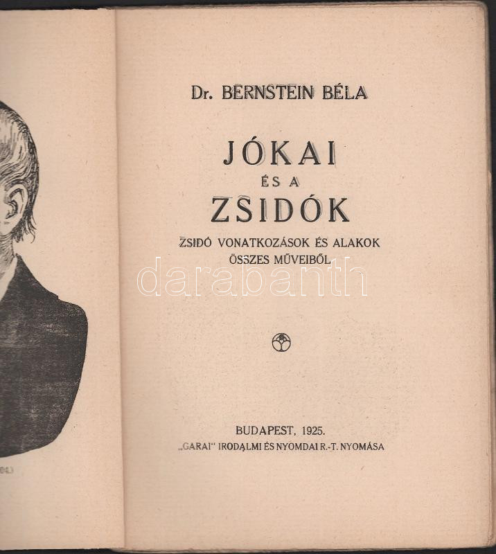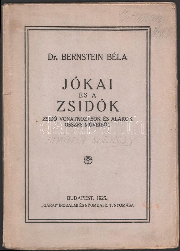 Bernstein Béla, Dr.: Jókai és a zsidók. Zsidó vonatkozások és alakok ö... https://www.darabanth.com/en/516-Auction-philately-postcards-numismatics-artwork-books-collectibles-jewelry/520.0/Books/Books-Judaica~1100/Bernstein-Bela-Dr-Jokai-es-a-zsidok-Zsido-vonatkozasok-es-alakok-osszes-muveibolBp-1925~II3499999