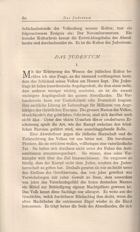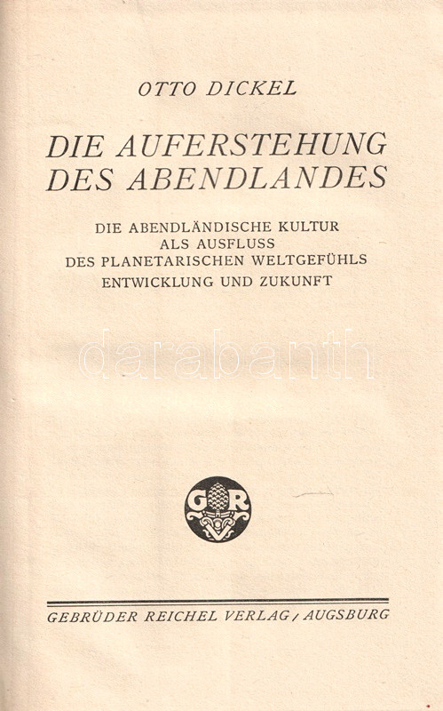 Otto Dickel (1880-1944) német gimnáziumi tanár, szélsőjobboldali ideológus és politikus, völkisch munkásvezér, a Weimari Köztársaság kezdetén a pán-germán, korporatív államban gondolkodó szakszervezeti mozgalom, a Deutsche Werkgemeinschaft alapítója. "Die Auferstehung des Abendlandes" (A Nyugat feltámadása) című munkája Oswald Spengler nagy hatású könyvével vitatkozik, és úgy látja, hogy a háborút elvesztő németség, bár a haszonleső kapitalizmus és nemzetközi érdek áldozata, amennyiben megőrzi idealizmusát és népi karakterét, a felemelkedő Nyugat vezető erejeként a jövő záloga lehet. Az antiszemita tézisekkel tűzdelt bölcseleti értekezés központi, középső fejezete a haszonlesés, a materializmus és a zsidóság között párhuzamokat lát. A munka egy évvel későbbi, átdolgozott kiadásának antiszemita jellege csak erősödött. Az 1920-as évek elején felmerült, hogy Otto Dickel fasiszta ihletésű szakszervezeti mozgalma egyesüljön a nemzetiszocialistákkal, de a fúzió ötletét idővel elvetették. A korai időkből származó, fajelméleti és kultúrmissziós fejtegetésekben gazdag munka igen ritkán fordul elő.