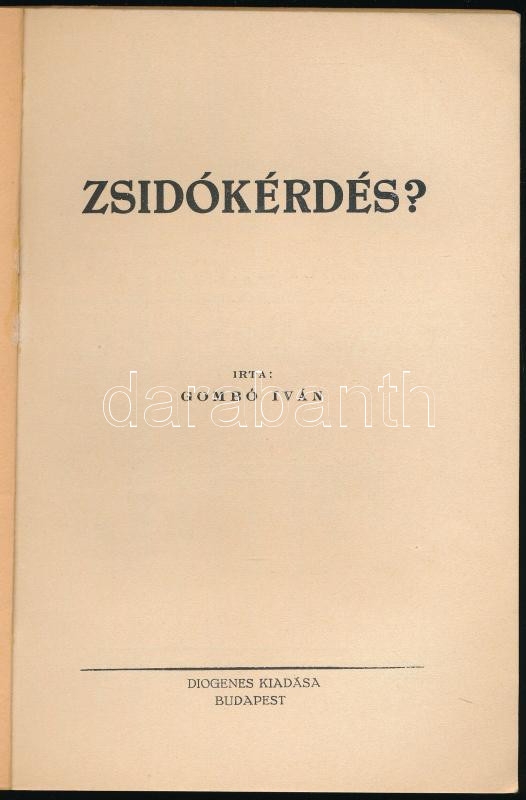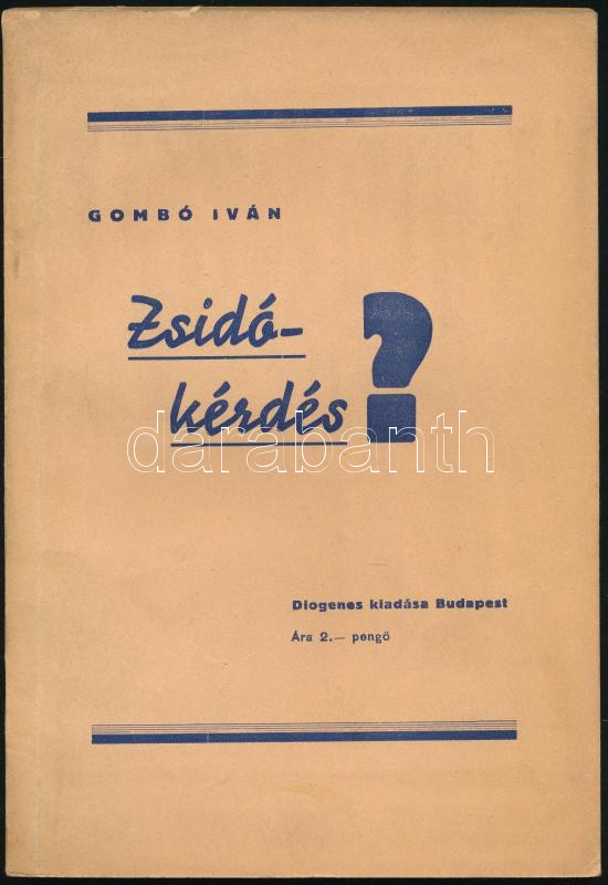 Gombó Iván Zsidókérdés? Bp., (1937). Diogenes. 87+(1) p. Számozatlan példány. Fűzve, kiadói papírborítóban. Csak 455 példány.