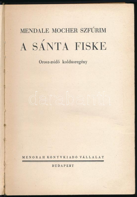 Mendale Mocher Szfúrim: A sánta fiske. Orosz-zsidó koldusregény. Fordította Benjamin Ben Kazari. Bp., é.n., Menorah Könyvkiadó Vállalat. Kiadói aranyozott egészvászon kötés,